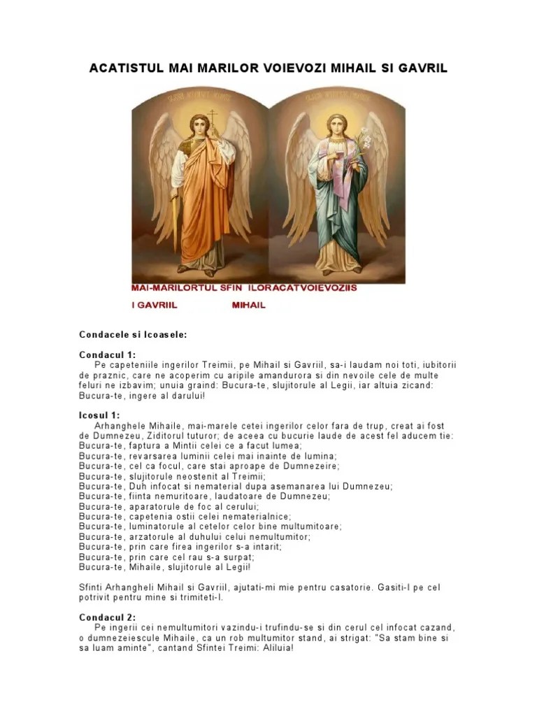 Rugăciunea către cei doi arhangheli care te scapă de necazuri... Se spune că aceștia îi ocrotesc pe oameni de la naștere și până la moarte. Sfinte și mare arhanghele al lui dumnezeu, mihaile, care cel dintâi între îngeri stai dinaintea treimii celei negrăite, sprijinul și păzitorul neamului omenesc, care ai zdrobit în ceruri cu oștile tale capul prea … Te scapă de rele şi îţi aduce bucurie, noroc şi sănătate! Mihail și gavril sunt recunoscuți ca îngeri conform tradiției populare, sfinții.