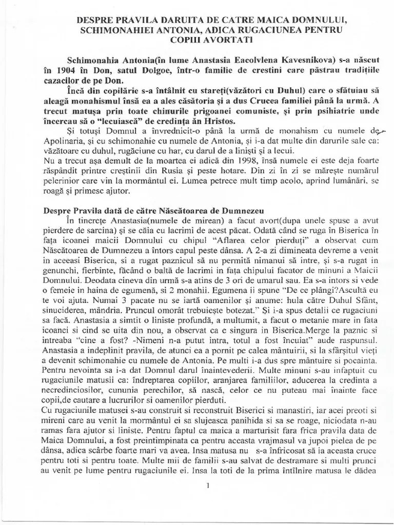 Schimonahia antonia (in lume anastasia eacolvlena kavesnikova) sa nascut in 1904 in don, satul dolgoe, intro familie de crestini care pastrau traditiile cazacilor de pe don. Acest pacat nu va fi iertat si nici sa nu fie iertat. Iar legat de faptul ca copilul avortat e blestemat nu e adevarat, a fost conceput de o persoana care nu e intreaga la cap. Rugăciunea mamei pentru copiii săi. 23.01.2016 · despre pravila daruita de catre maica domnului, schimonahiei antonia, adica rugaciunea pentru copii avortati.. Dumnezeule, ziditorule al tuturor făpturilor!