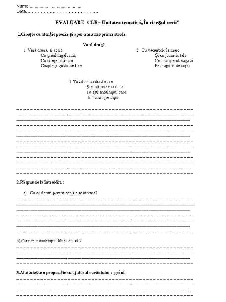 Aplicare din 1 septembrie 2015.. 10/06/2019 · o fișă complexă, cu conținuturi bine elaborate din punct de vedere științific, metodologic și terminologic. Fiind o fișă de evaluare finală, am apreciat că vizează în mod egal toate competențele impuse de curriculumul în … Activitați didactice pentru ințelegerea textului liric_dimofte cristina maria.pdf. Cu doar un clic poți avea această evaluare inițială pentru a testa cunoștințele elevilor la început de clasă pregătitoare. Teste de evaluare finala standard. Citește cu atenție textul urmator și raspunde cerințelor:. 10/06/2019 · o fișă complexă, cu conținuturi bine elaborate din punct de vedere științific, metodologic și terminologic.